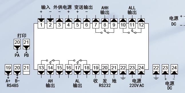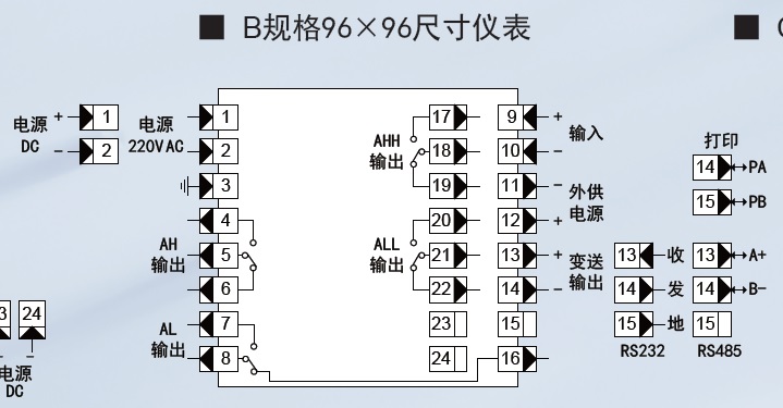 双显示,10点报警输出,变送输出,通讯接口:RS 232或RS 485,外供传感器电源 |