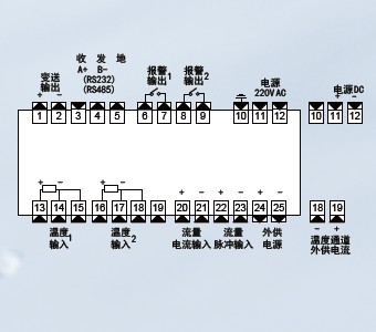 ■ 可选配2点报警输出,实现各测量值的报警和累积量的预置输出。