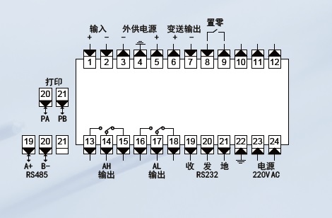 双显示,10点报警输出,变送输出,通讯接口:RS 232或RS 485,外供传感器电源 |