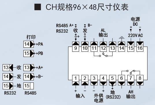 双显示,10点报警输出,变送输出,通讯接口:RS 232或RS 485,外供传感器电源 |