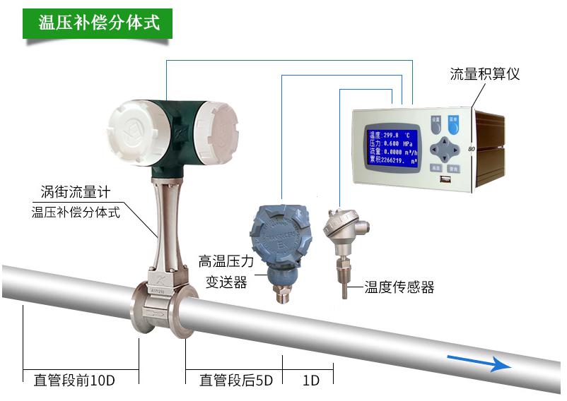 迪泰尔温压补偿一体化涡街流量计可以替换在现场无法正常工作的分流旋翼式蒸汽流量计,现场液晶表头显示瞬时流量、累积流量,切换显示实时温度、实时压力、有温度、压力补偿功能。 迪泰尔分体式涡街流量计测量蒸汽时,主要由四部分组成:涡街流量传感器,压力变送器,温度传感器,液晶记录仪。蒸汽流量计 可选温度压力补偿型涡街流量计测量过热蒸汽或者饱和蒸汽精度高;测量饱和蒸汽可选温度补偿型涡街流量计 或者压力补偿型涡街流量计。