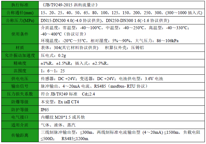 涡街流量传感器具有结构简单、通用性好和稳定性高的特点。 传感器口径:DN15 -DN300 (插入式为DN250 - DN1200 ,广泛应用于测量过热蒸汽、饱和蒸汽、压缩空气和一般气体及液体的体积流量。 测量流体:饱和蒸汽、过热蒸汽、气体、液体(避免多相流) 测量精确度及重复性结构类型 管段式 气体(含蒸汽)精确度士1.5 % 重复性(脉冲)0.5 % 液体 精确度士1.0 % 重复性(脉冲)0.33 % 插入式 气体 精确度士3.0% 重复性(脉冲)1.0 % 液体 精确度士2.5 % 重复性(脉冲)0.83 % 测量范围 测量流体 气体(含蒸汽) 流速下限(7m/s ) 流速下限(55m/s) (DN≥ 200 为50)液体 流速下限(0.7m/s ) 流速下限(5.5m/s) 额定压力:GB 1.6Mpa 、2.5Mpa 、4.0Mpa 、6.4Mpa介质温度:-40 -250 ℃ (普通型,插入式-40-120 ℃ ), 100-350 ℃(高温型)结构类型:管段式涡街流量计传感器、插入式涡街流量传感器传感器表体304不锈钢 旋涡发生体304 不锈钢检测探头304,不锈钢连杆304 不锈钢 散热器铝合金 垫片耐高温石棉垫、橡胶垫片、石墨垫片;
